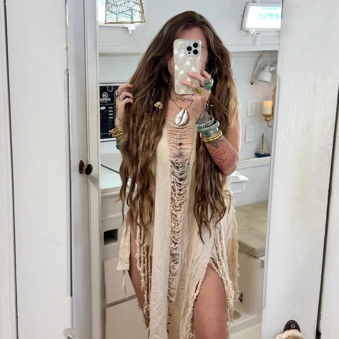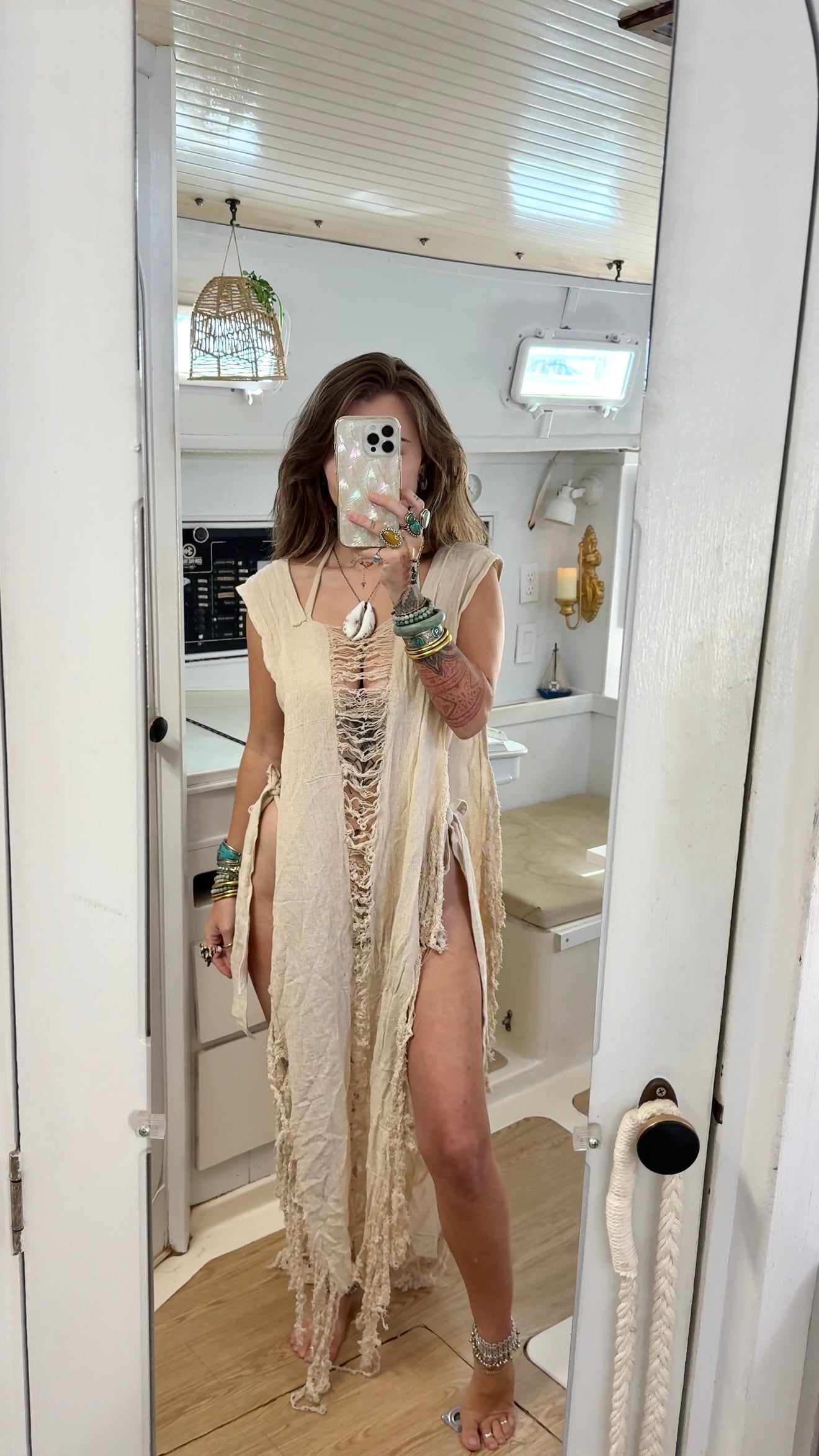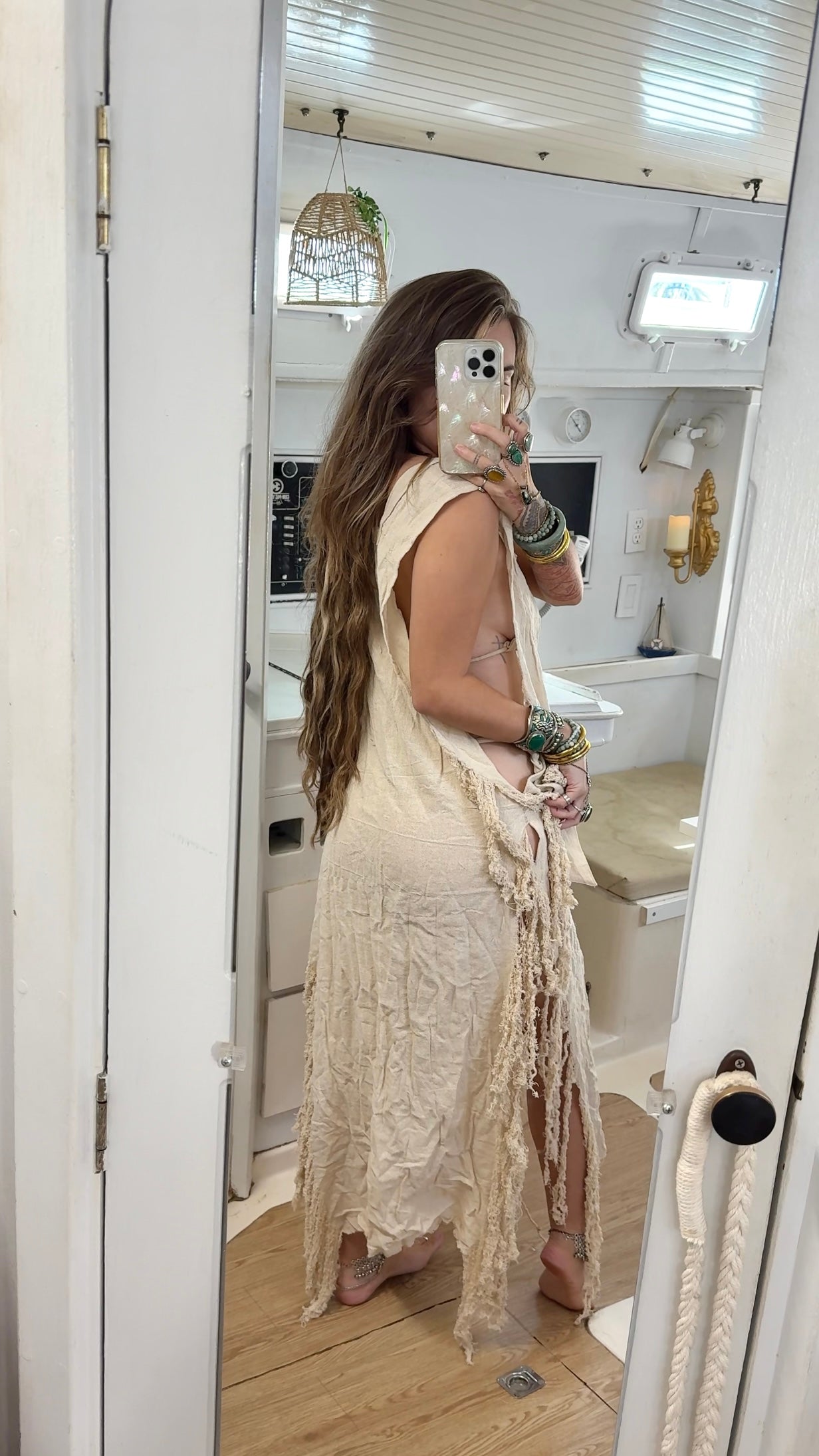 Luxurious beach cover up, open sides, covered back, reversible, very flowy, breathable, and comfy. you can tie the fringe together to close the sides