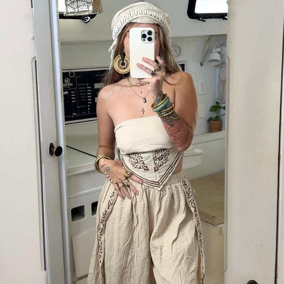 Creation Process: These pieces are meticulously handmade using premium, organic, raw materials and chemical free dyes. The team of artisans who took part of the creation process are not only paid a living wage, but create everything from scratch using sustainable zero waste practices. Crafted by skilled local artisans, these garments are created in harmony with nature- designed to honor the Earth while inspiring balance and mindfulness in your everyday life.
