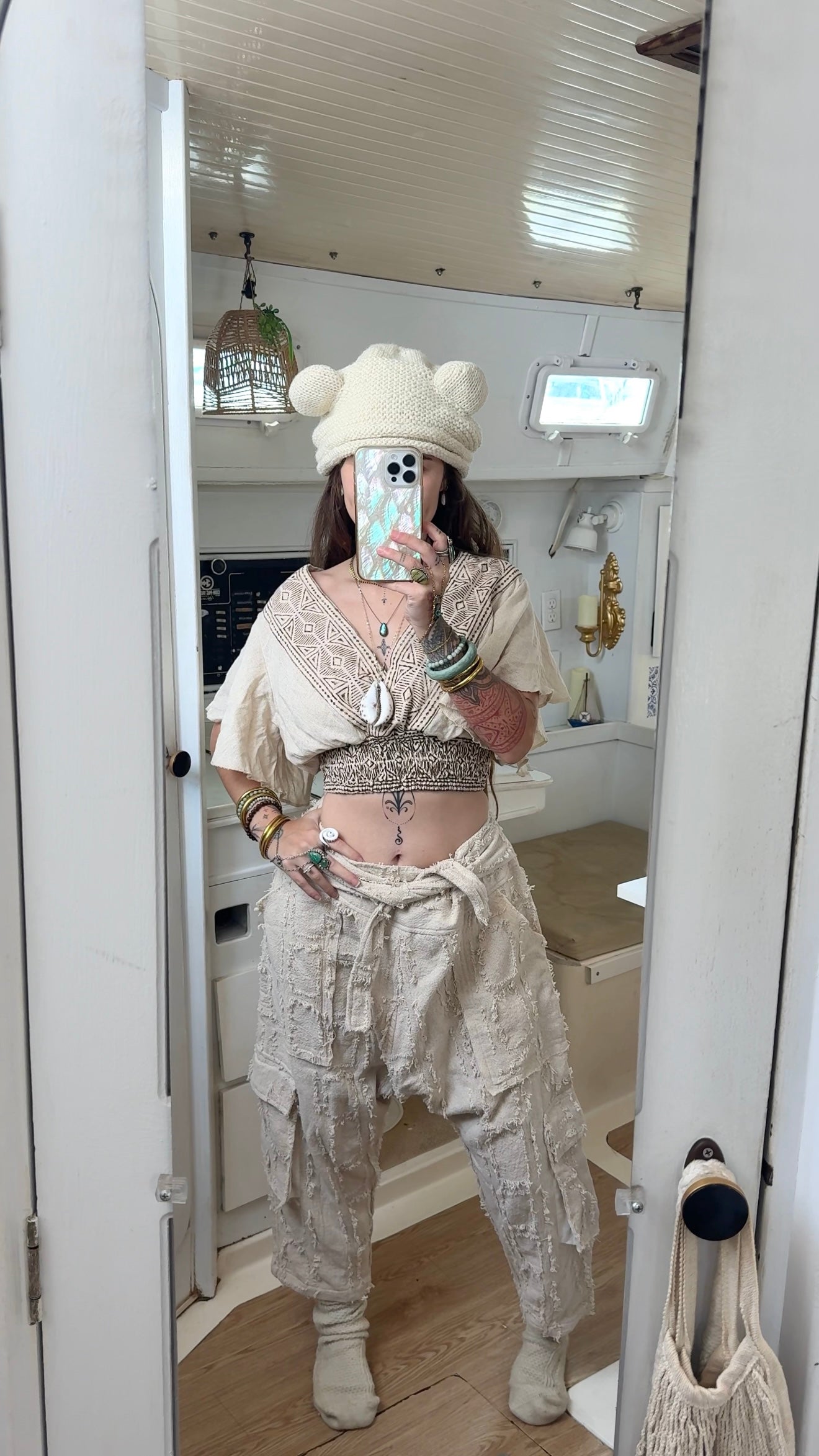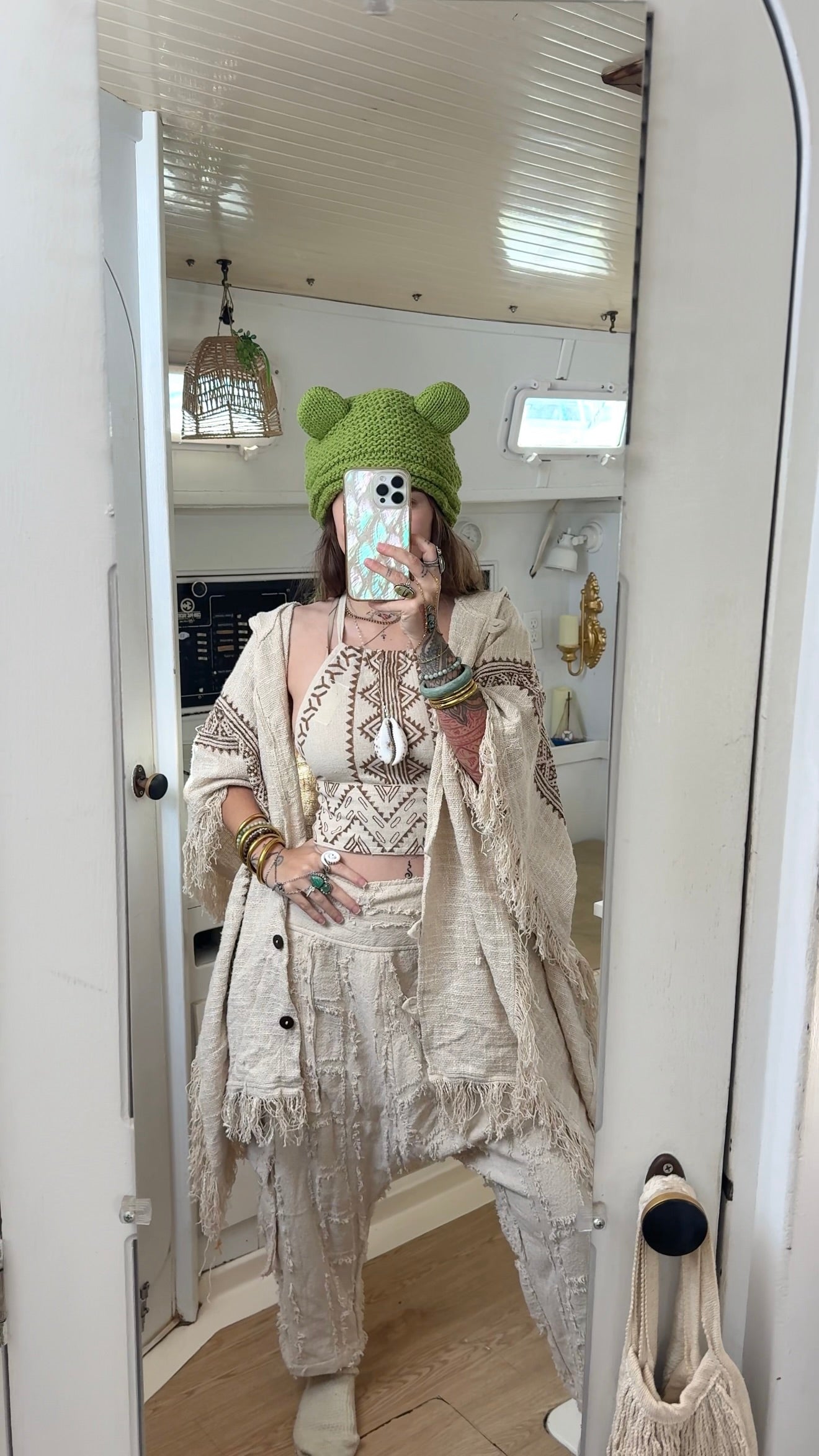 Creation Process: These pieces are meticulously handmade using premium, organic, raw materials and chemical free dyes. The team of artisans who took part of the creation process are not only paid a living wage, but create everything from scratch using sustainable zero waste practices. Crafted by skilled local artisans, these garments are created in harmony with nature- designed to honor the Earth while inspiring balance and mindfulness in your everyday life.